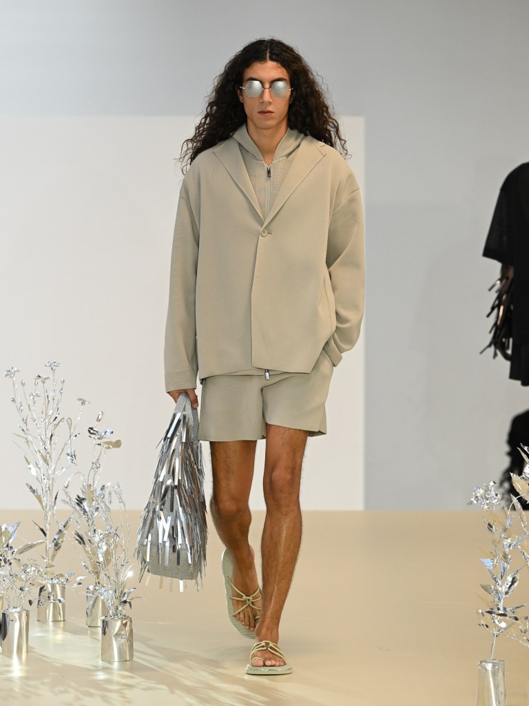 Takahashi’s influences for this collection are deeply rooted in the contrast between the metallic, futuristic vision of The Line and the natural, arid landscapes of the desert. This juxtaposition is reflected in the collection’s aesthetic, which marries sleek, futuristic designs with a touch of organic ease and comfort. The use of rectangular metallic sequins, hand-applied to CFCL’s signature dense knits, introduces a sparkling dynamism to the collection, echoing the metallic nature of The Line’s urban vision.