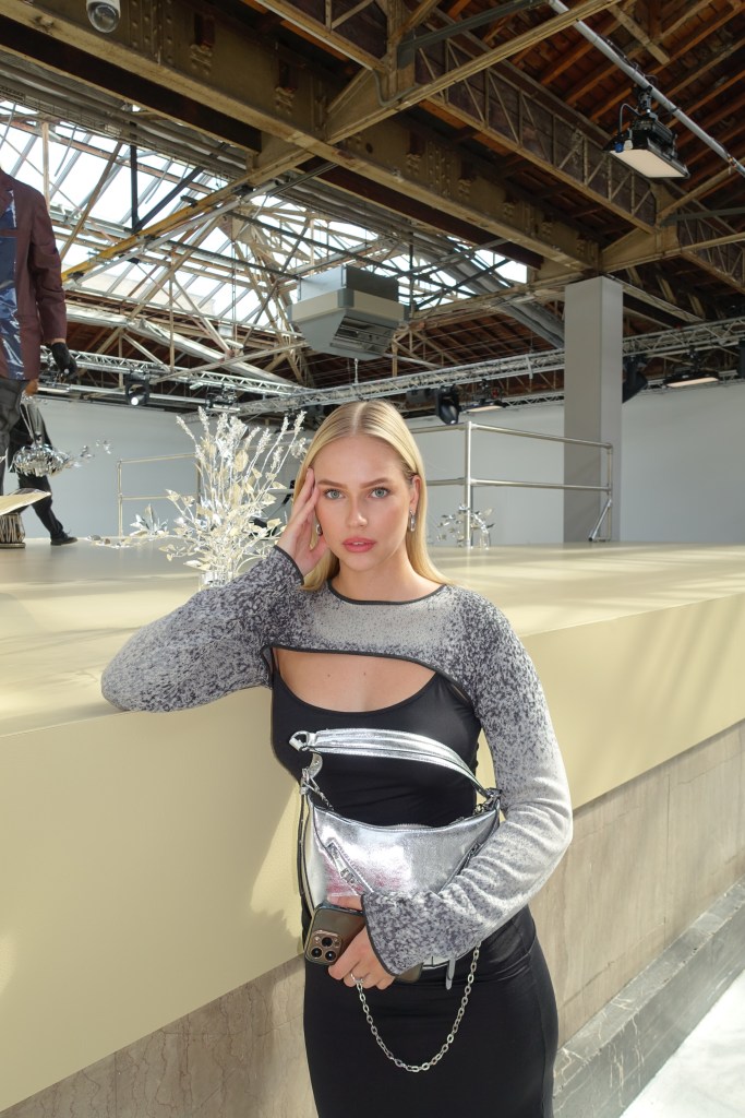 The collection was presented at the Palais de Tokyo’s haute galerie, an apt choice for a collection that bridges the gap between art, technology, and fashion. The venue was adorned with delicate aluminum houseplants by Japanese artist Toshihiko Mitsuya, further emphasizing the metallic theme and the dialogue between the natural and the artificial. The show’s music—a fusion of traditional Indian tabla drums with an electronic soundscape—underscored the collection’s theme of human creativity versus machine, a topic Takahashi is passionate about.