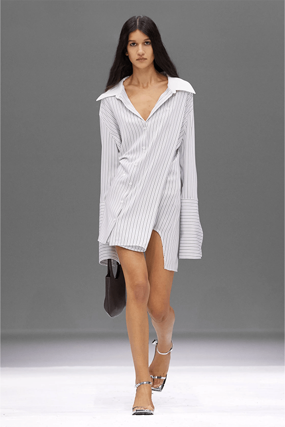 The collection was marked by its simplicity and sophistication, with Di Felice taking oversized school uniform staples—shirts, white tees, polo shirts, a Harrington jacket—and reconstructing them into leggy, asymmetrical shapes. This approach not only paid homage to the brand’s minimalist aesthetic but also introduced a fresh, youthful dynamism into the pieces. Noteworthy items included ‘elliptical’ skirts and diagonally-slashed biker flares, which seamlessly merged Di Felice’s design sensibilities with André Courrèges’s geometric design methods.