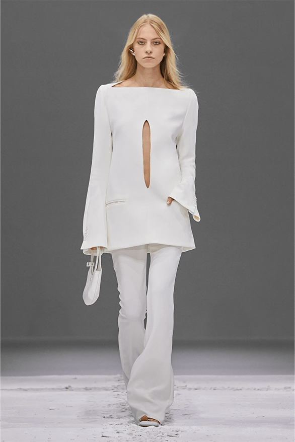 A standout piece was a long-stemmed fitted tailored coat with fluted sleeves and a buckled neckline, epitomizing minimal French chic. The collection also ventured into tunics over pants, blending Courrèges’s heritage with ’90s influences to create something entirely new and directional.